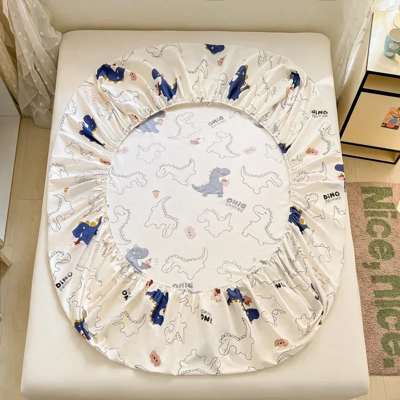 Made from 100% soft and breathable cotton for comfort. Cute dinosaur cartoon prints make bedtime fun for kids. Elastic fitted design ensures snug, wrinkle-free mattress coverage. Durable and easy-to-wash for everyday use. Perfect for children’s bedrooms or as a gift. Lightweight yet cozy, ideal for year-round comfort.