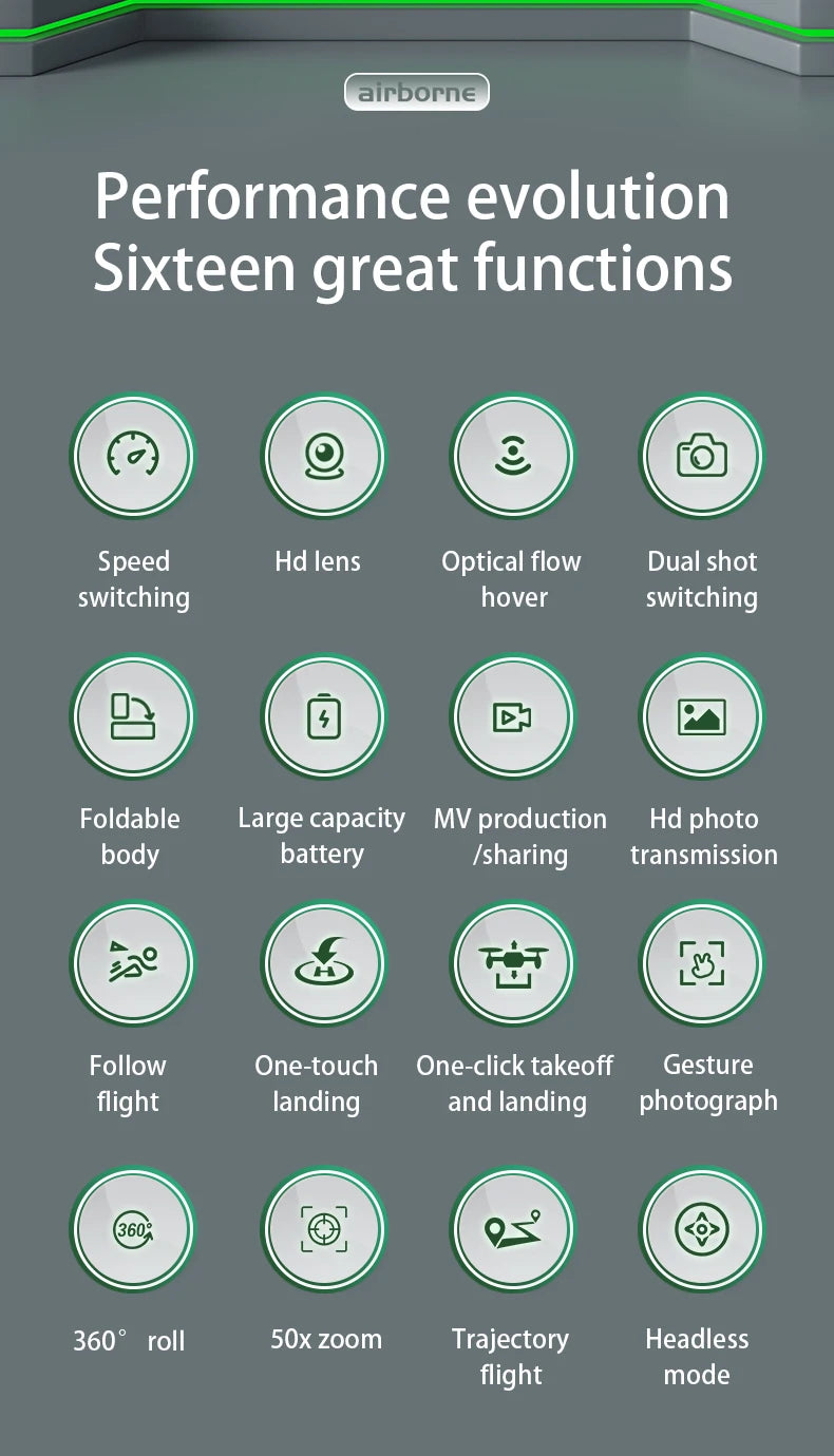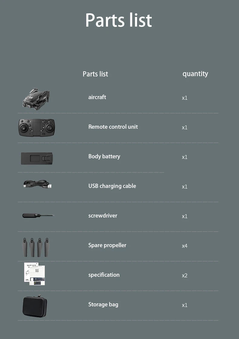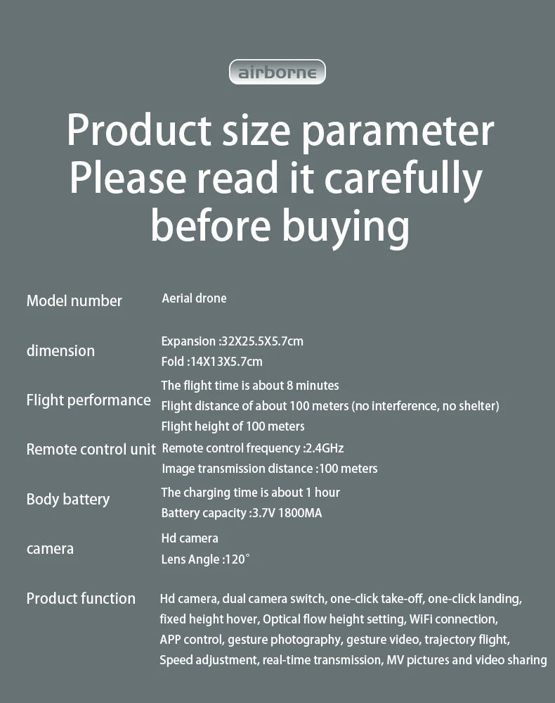1 key take off/1 key soil/rise/fall/left/right turn/forward/backward/left fly/right fly/Intelligent follow/atmospheric pressure height/roll/Headless mode/Fast/slow/photo/visual frequency/dual camera/face/gesture recognition automatic photo/gravity sensing/trajectory flight /