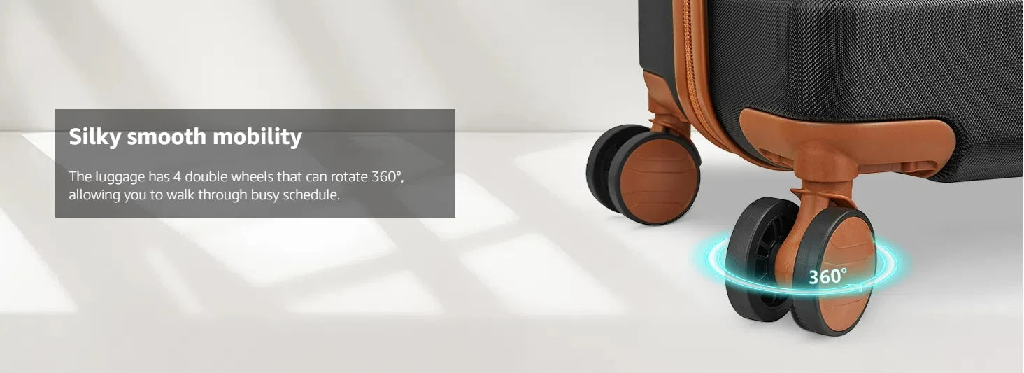 360° Smooth Silent Spinner Wheels:360° Spinner Double Wheels Rolling suitcases with wheels with soft rubber and lubricating balls inside wheels which could moves silent and smoothly.