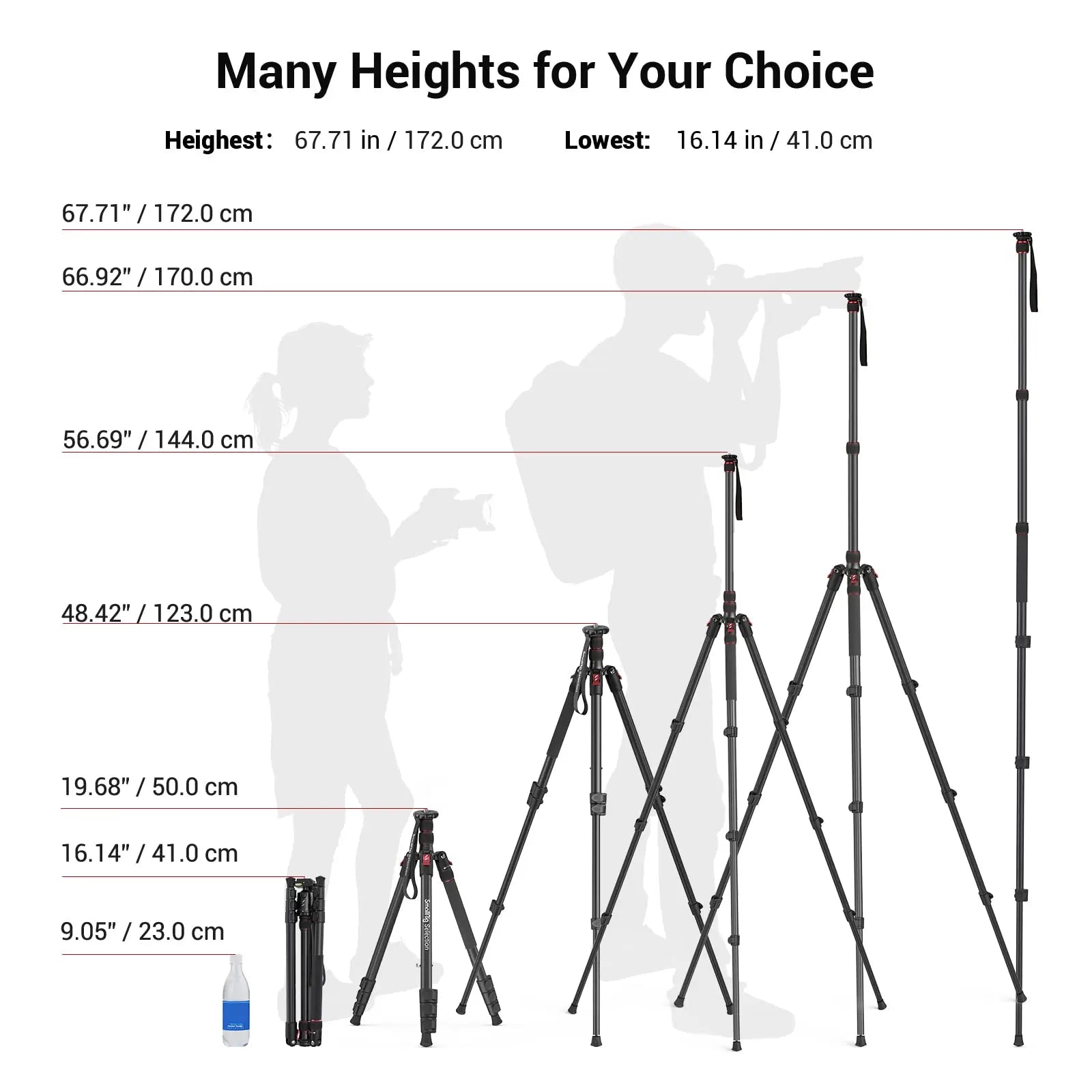 SmallRig T-10 Aluminum Alloy Tripod 3983 is designedmainly forvideoing, filming, live streaming, etc.Able to extend up to 170cmand fold in 41cm, this compact item weighs only 1100g, suitable for outdoor photography. The robust aluminium alloy feet can hold up to 15kg, with three 1/4"-20 threaded holes at the bracket for attaching devices asneeded. The bottom ballhead has a built-in 1/4"-20×3/8''-16 dowel screwfor compatible photographic devices. Thetripod can be easily turned into a monopodfor quickly switching from scene to scene.